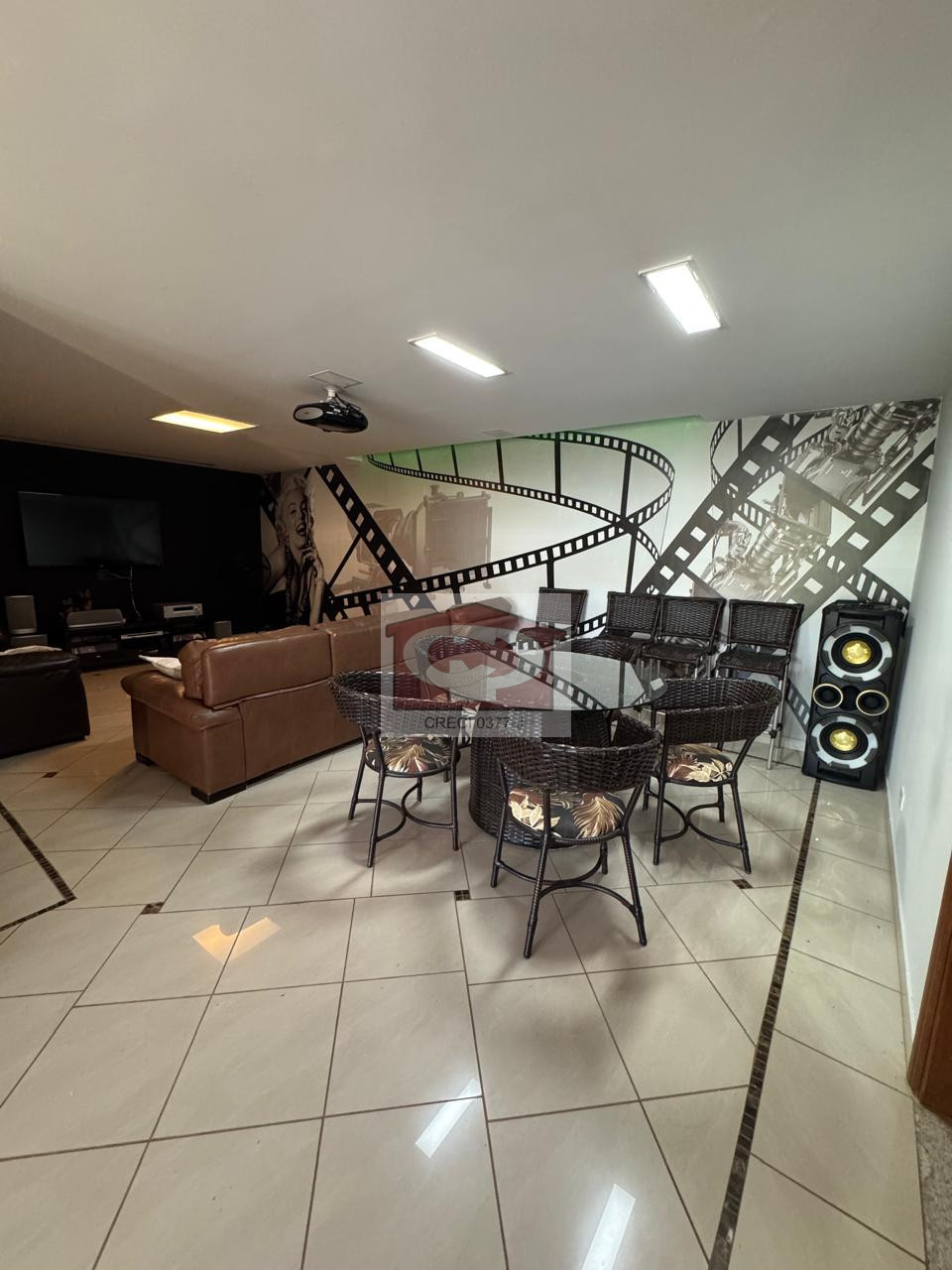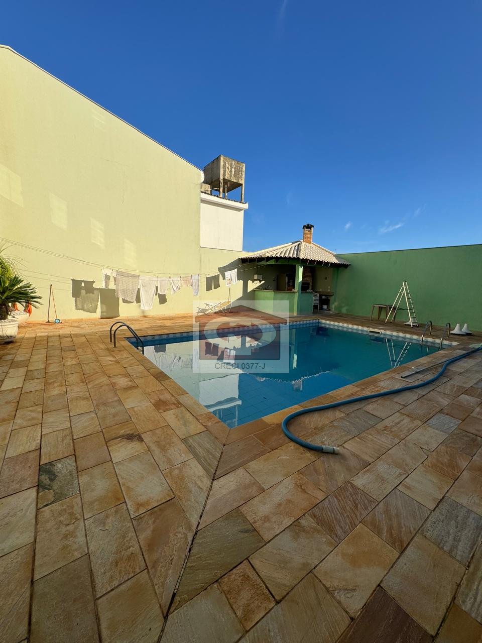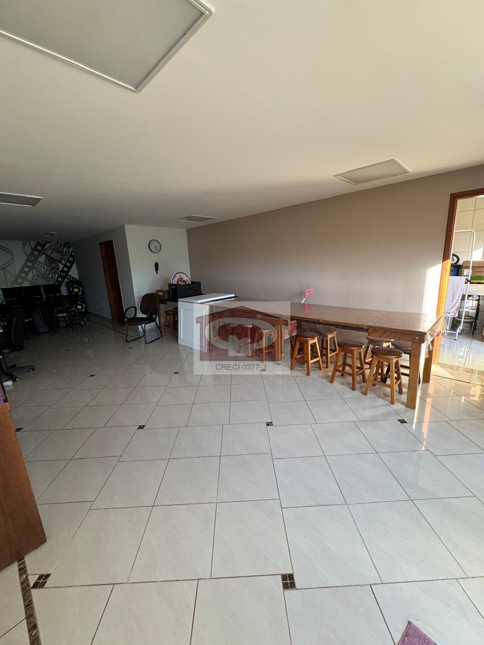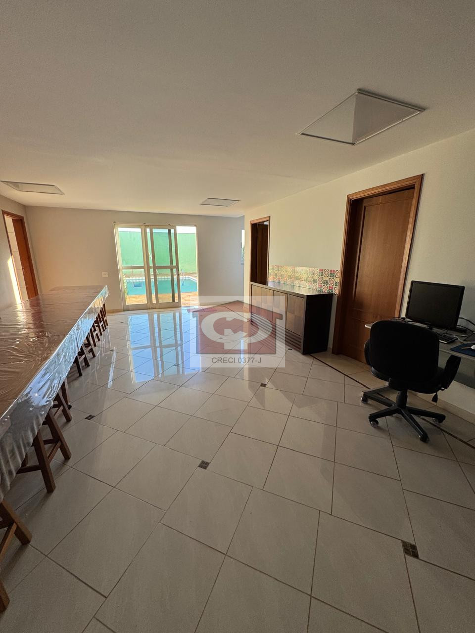 O piso inferior é dedicado ao lazer, com um amplo salão de festas que conta com acesso direto à piscina e churrasqueira, além de área de serviço, ideal para quem busca espaço tanto para residir quanto para empreender.