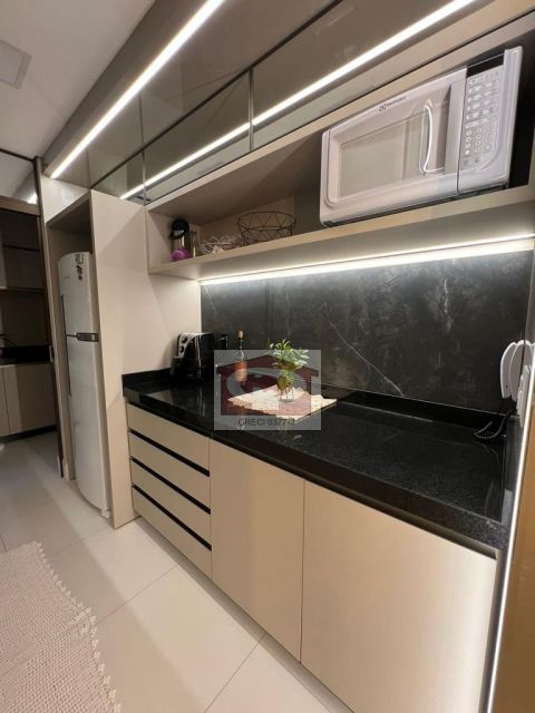 O apartamento é inteiro mobiliado, com 02 quartos sendo uma suíte grande (com closet), 03 pontos de ar condicionado (suíte, quarto e churrasqueira).