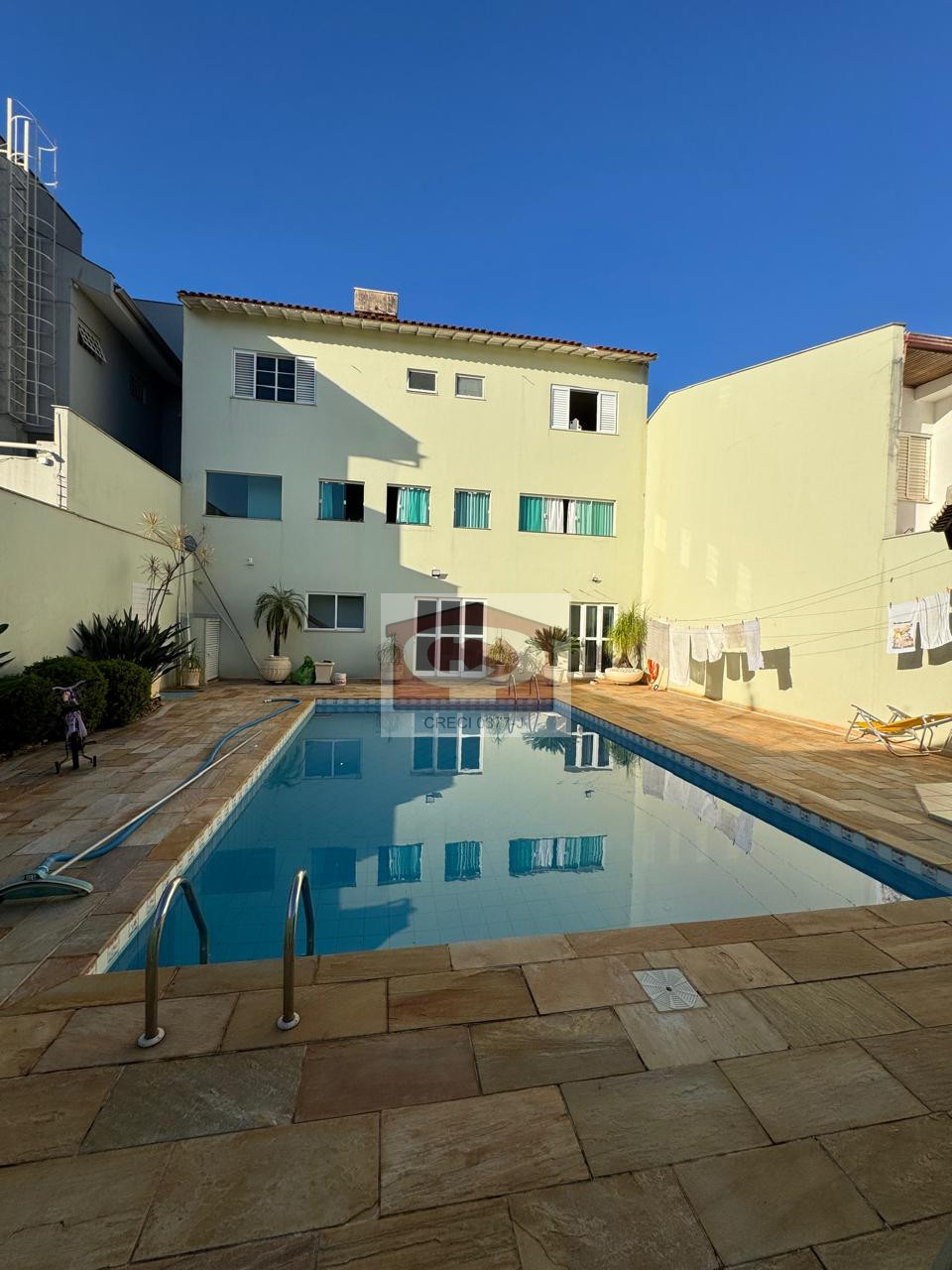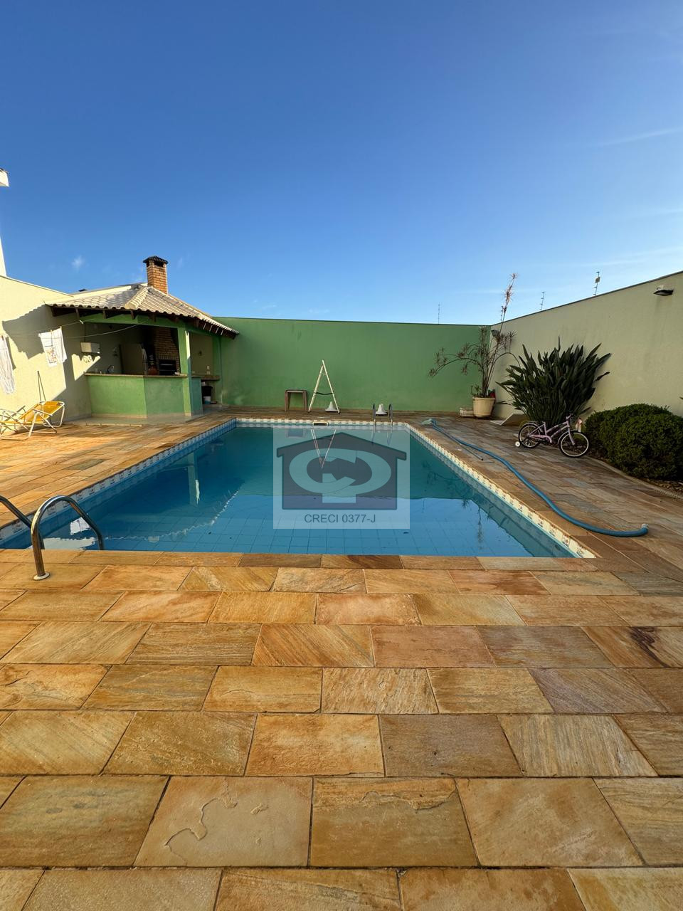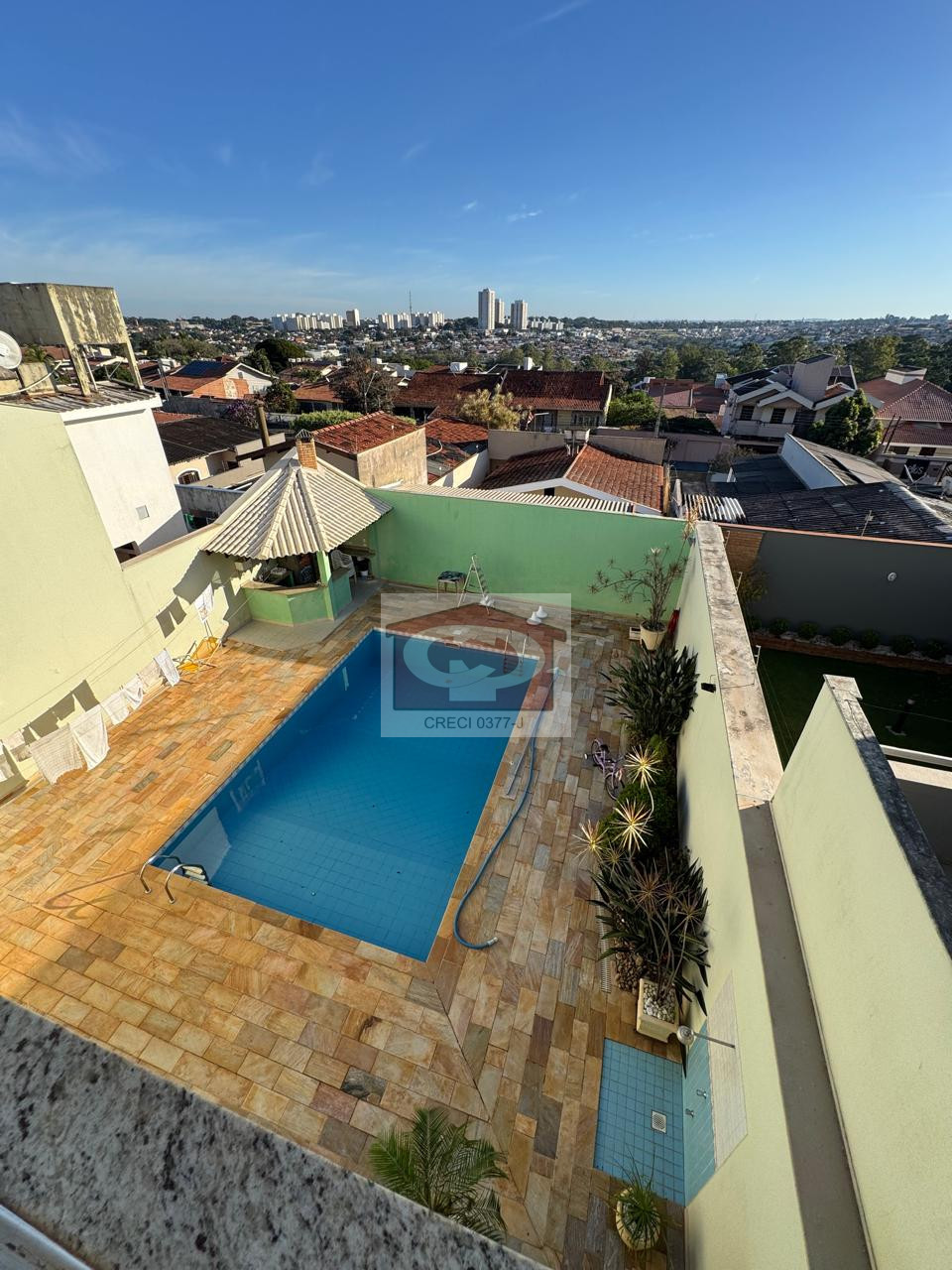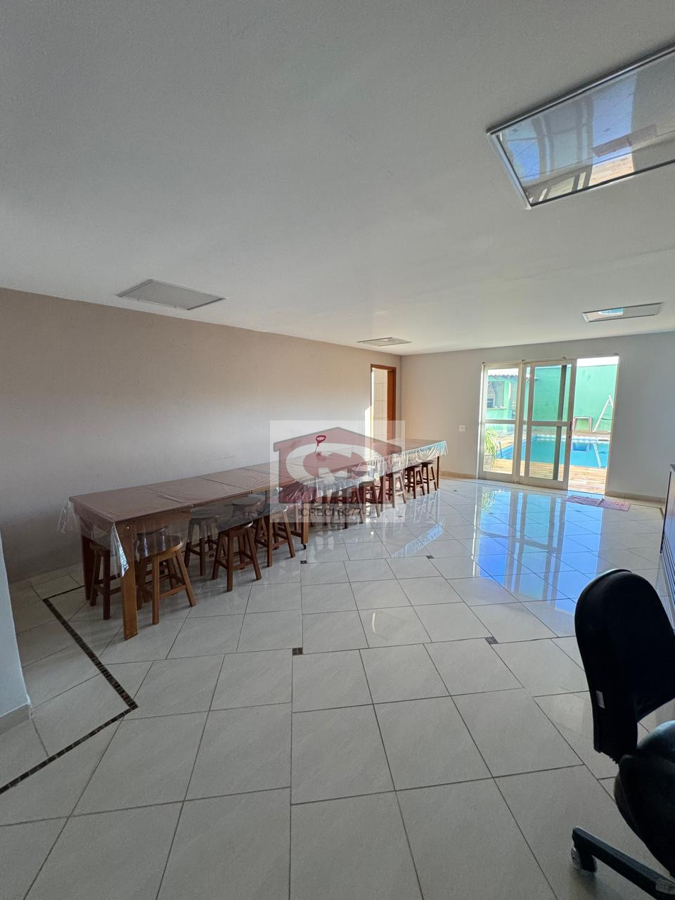 O piso inferior é dedicado ao lazer, com um amplo salão de festas que conta com acesso direto à piscina e churrasqueira, além de área de serviço, ideal para quem busca espaço tanto para residir quanto para empreender.